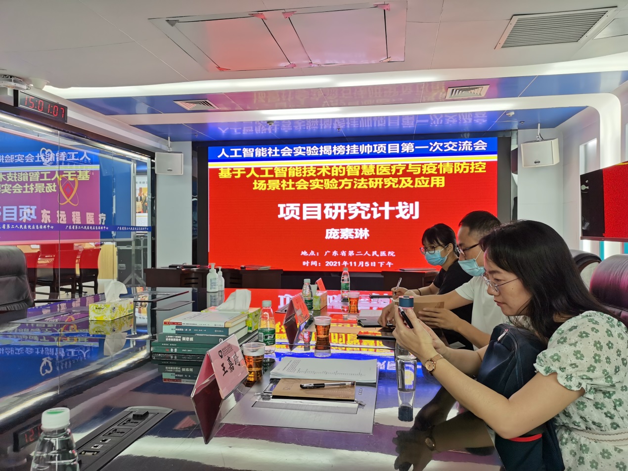 2021年11月5日下午,人工智能社会实验项目“基于人工智能技术的智慧医疗与疫情防控场景社会实验方法研究及应用”首次交流会在广东省应急医院举行,参加交流会的有暨南大学应急管理学院庞素琳教授团队、广东省应急医院瞿红鹰院长团队、广州市疾病预防控制中心张周斌副主任团队以及项目指导单位琶洲实验室战略研究中心徐晨主任团队。交流会由瞿红鹰院长主持。